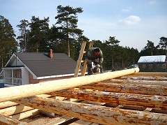 В углах сруба, а также в местах, где в будущем будут размещаться дверные и оконные проемы, с помощью специальной дрели делаются отверстия под деревянные нагеля, использование которых необходимо с целью предотвращения смещения бревен сруба дома или бани относительно друг друг в горизонтальной плоскости. Нагель толщиной 22- 28 мм забивается в отверстие при помощи специальной кувалды. Все нагеля обязательно углубляются в отверстие на 2-3 см, чтобы во время усадки сруба они не выталкивали прикрывающие их бревна. Для подъема бревен используется специальная техника. Результат: полностью собранная коробка, возведенная с учетом будущей усадки сруба.